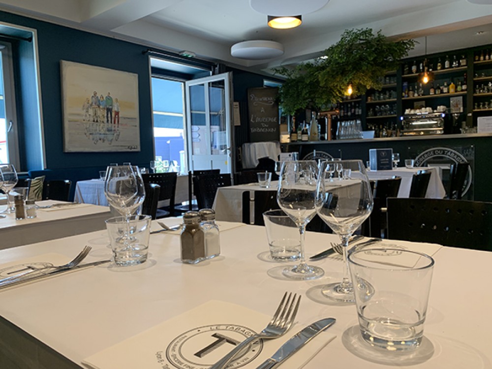 À l’intérieur de l’Auberge, on retrouve la signature caractéristique du Tabagnon avec cette teinte bleu pétrole et les tapisseries florales qu’on retrouve dans tous les restaurants du groupe. L’ambiance est feutrée et la décoration réalisée avec goût. La première salle intègre le bar, vous plongeant dans une atmosphère agréable qui rappelle les bistrots d’antan. À l’entrée dans le restaurant, l’atmosphère est tout de suite posée ! La patte du groupe a été apportée avec beaucoup de finesse, en tenant compte de l’histoire du lieu, sublimant ainsi de très beaux détails comme le sol en mosaïque de la seconde salle, aménagée façon « cave à vin ». Intimiste, cette salle accueille régulièrement de petits événements privés ou professionnels, et permet ainsi à l’établissement de proposer une offre complète de solutions de privatisations. N’hésitez pas à rentrer en contact avec l’équipe du Tabagnon pour leur exposer votre besoin !